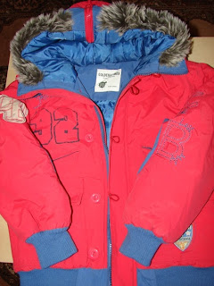Geaca e super-faina, groasa, cu gluga cu fermoar care o desface si se lasa fain pe spate. Din cauza inscriptiei de pe spate, eu as recomanda-o ptr baieti. Are cateva mici pete, de aia e asa ieftina, dar nu sunt f proeminente (la cerere trimit poze mai detaliate).